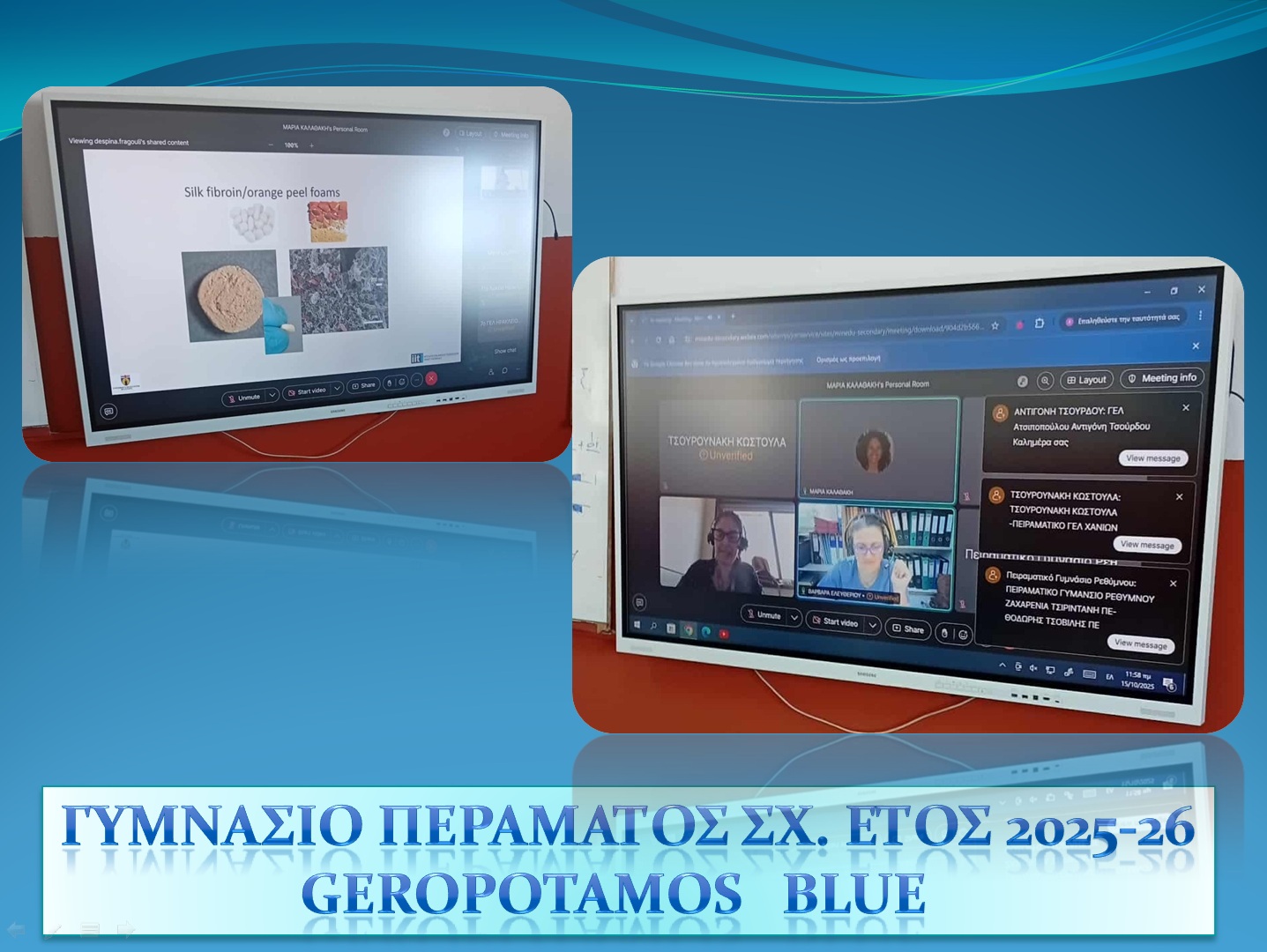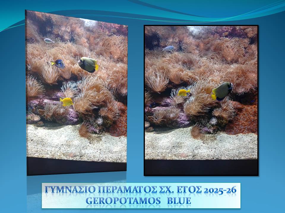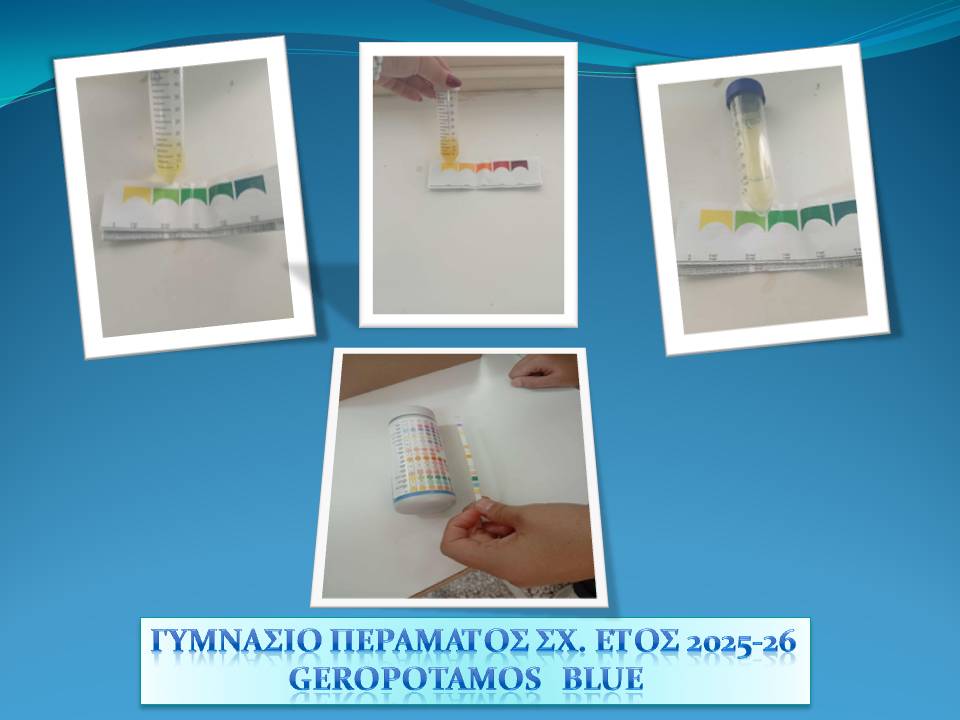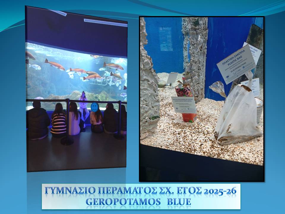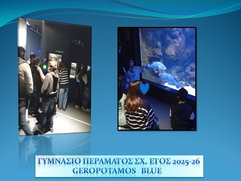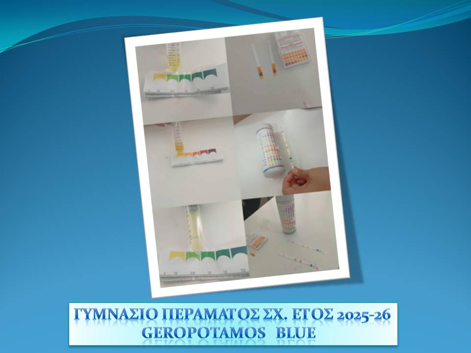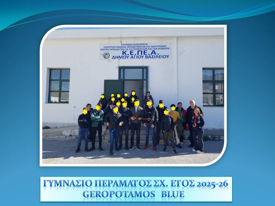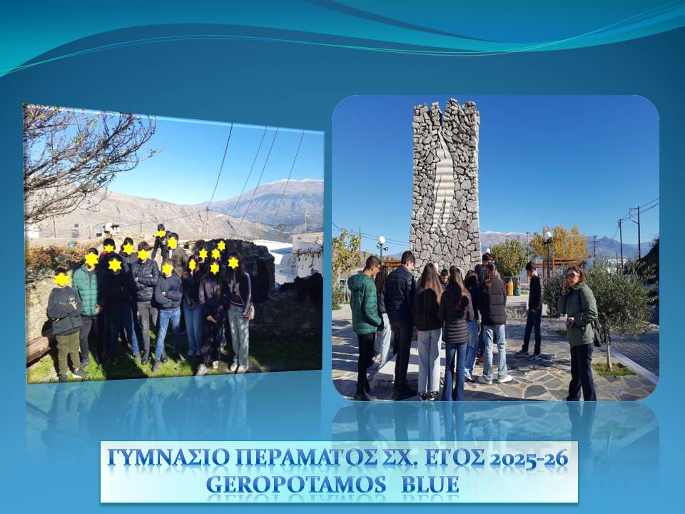 Εκπαιδευτική Δράση 27 Οκτωβρίου 2025 Geropotamos Blue – EUBlue Schools: «Ρέοντας μαζί για ένα γαλάζιο αύριο» με συντονίστριες την Κάλλια Κουγιανού, Χημικό και Πόπη Γιαννιού, Γεωλόγο από το Γυμνάσιο Περάματος (Ρέθυμνο).
