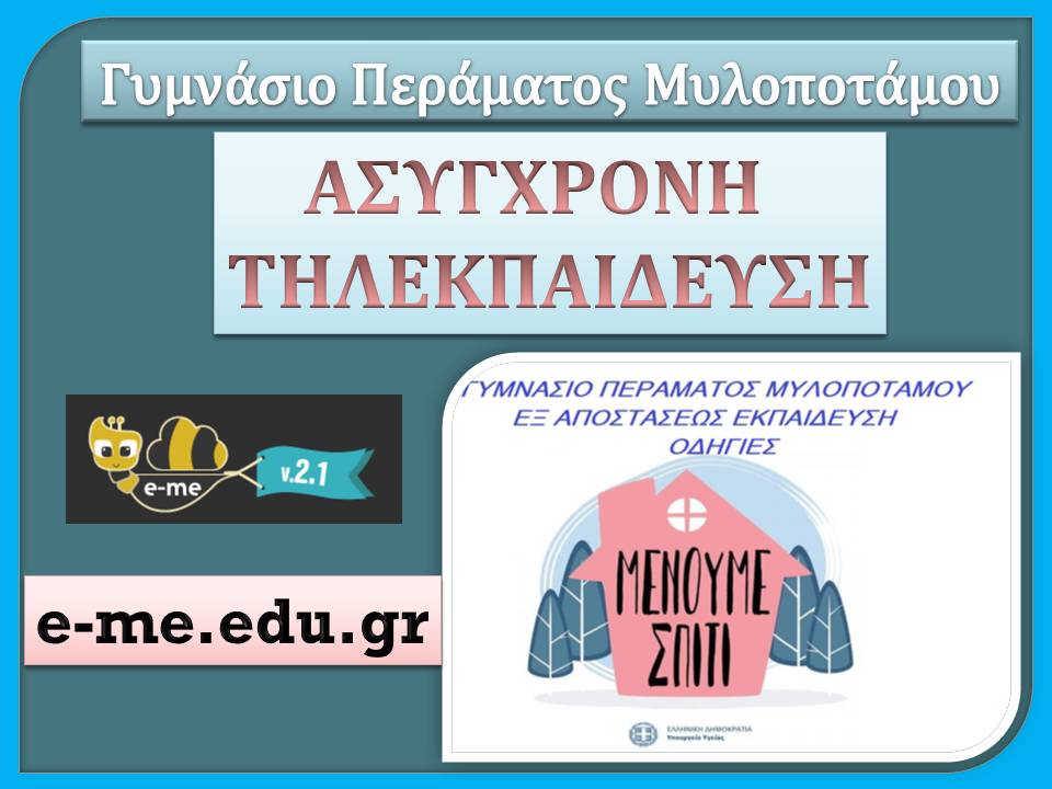 Αγαπητοί γονείς και μαθητές του Γυμνασίου Περάματος σας ενημερώνουμε ότι η Ασύγχρονη Εξ Αποστάσεως Εκπαίδευση ξεκίνησε και φέτος. Όσοι μαθητές έχουν αποκτήσει λογαριασμούς του Πανελλήνιου Σχολικού Δικτύου μπορούν να ακολουθήσουν τα παρακάτω βήματα για να εισέλθουν στην πλατφόρμα e-me.edu.gr που χρησιμοποιούν οι εκπαιδευτικοί του σχολείου μας ή στην πλατφόρμα της ηλεκτρονικής τάξης eclass.sch.gr .
