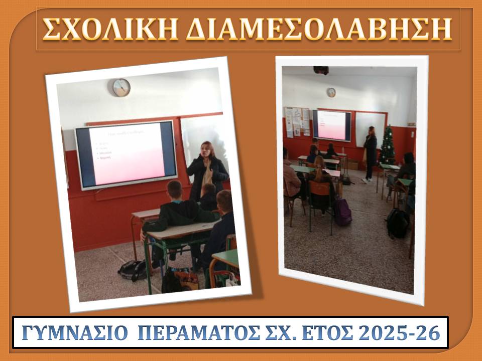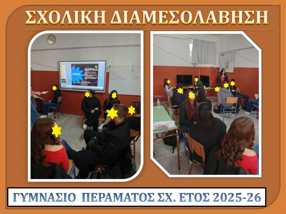 Με επιτυχία πραγματοποιήθηκε στο Γυμνάσιό μας την Παρασκευή 20/12/25 η επιμορφωτική δράση για τους μαθητές/τριες – διαμεσολαβητές, σε συνεργασία με το Κέντρο Πρόληψης, στο πλαίσιο των δράσεων των Συμβούλων Σχολικής Ζωής.