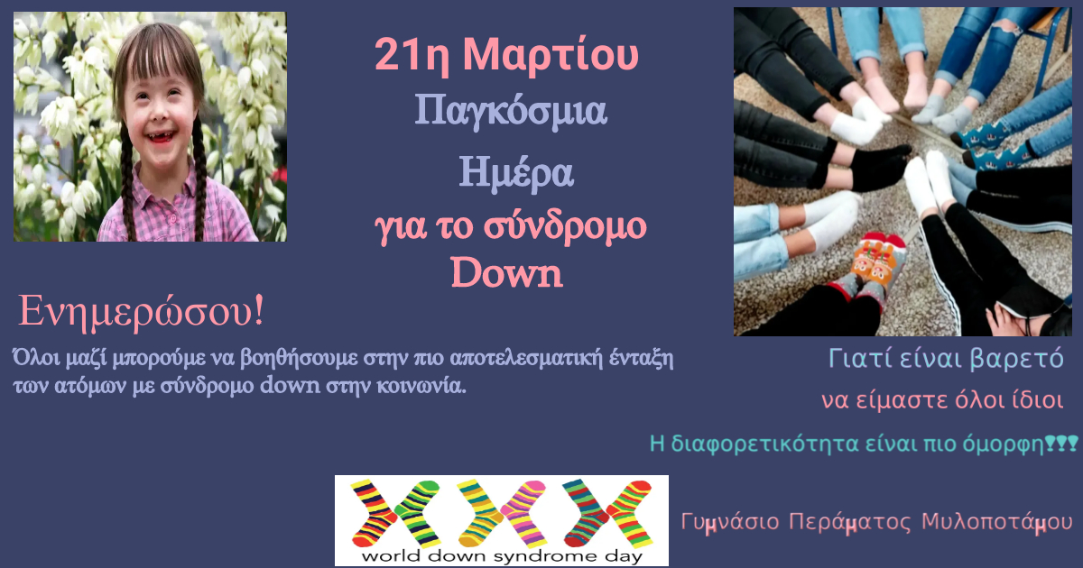 Στις 21 Μαρτίου οι μαθητές τμημάτων του γυμνασίου Περάματος ενημερώθηκαν για το σύνδρομο Down. Αναγνωρίσαμε χαρακτηριστικά των ατόμων με το σύνδρομο αυτό, ανακαλύψαμε ότι είναι δίπλα μας, ότι όλοι γνωρίζουμε άτομα με down που βρίσκονται είτε στον περίγυρο μας είτε στις οικογένειές μας.