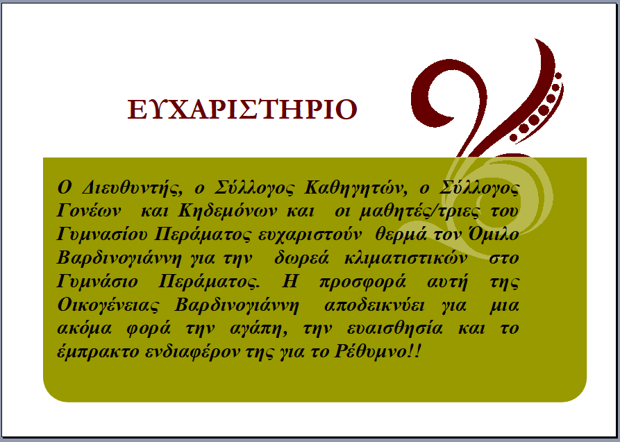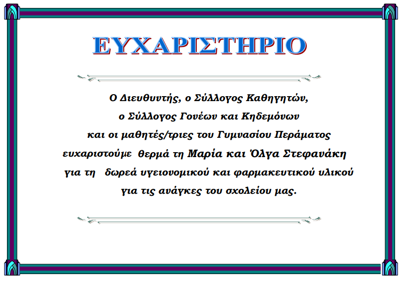 Ευχαριστουμε πολύ τον Προϊστάμενο κ.Τρικάλη Κωνσταντίνο και τα μέλη παιδαγωγικής ομάδας κ. Παπαδάκη Βιολέττα-Γεωργία Βιολόγος, όπως και την κ.Μαραγγέλη Χριστίνα Δασκάλα