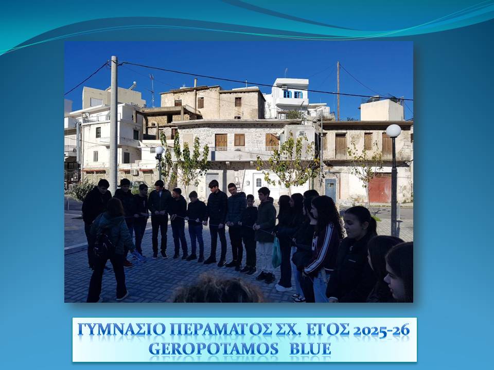 Το “GeropotamosBlue” είναι ένα περιβαλλοντικό εκπαιδευτικό πρόγραμμα που συνδέει τους μαθητές με τον ποταμό Γεροπόταμο, έναν πολύτιμο υγροβιότοπο κοντά στο Πέραμα Ρεθύμνου. Μέσα από πεζοπορίες, παρατηρήσεις, μετρήσεις και δράσεις συνεργασίας με την τοπική κοινότητα, οι μαθητές ανακαλύπτουν τη φυσική και πολιτιστική αξία του ποταμού και γίνονται πρεσβευτές της προστασίας του.