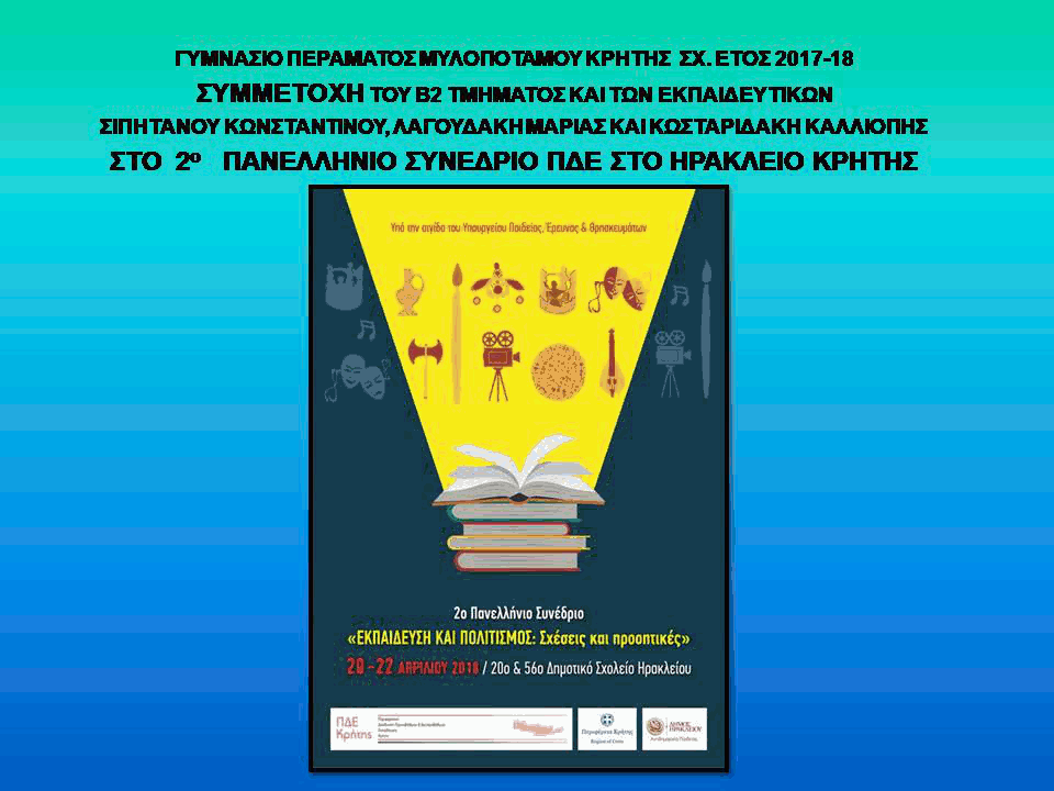Έκλεψε τις εντυπώσεις και κέρδισε τον θαυμασμό και τα συγχαρητήρια όλων όσων την είδαν η συμμετοχή του σχολείου μας στο 2ο Πανελλήνιο συνέδριο ΠΔΕ Κρήτης που έλαβε χώρα στο υπέροχο 20ο ΔΣ Ηρακλείου στις 20/4/2018. Το σχολείο μας συμμετείχε με Αναρτημένη Ανακοίνωση (Poster) με τίτλο "Αναζητώντας τις δημοκρατικές σχέσεις στο σχολείο" που παρουσίαζε την έρευνα των μαθητών του Β2 του σχολείου μας και των εκπαιδευτικών: Σιπητάνου Κωνσταντίνου, Κωσταριδάκη Καλλιόπης και Μαρίας Λαγουδάκη. Πολλά συγχαρητήρια σε όλους!!