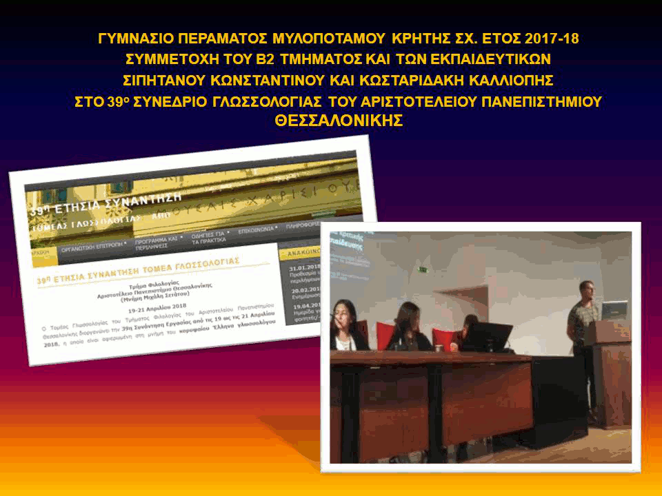 Παράλληλα βέβαια με την παρουσίαση αυτή και την ίδια περίπου ώρα, στο Αριστοτέλειο Πανεπιστήμιο ΘΕΣΣΑΛΟΝΙΚΗΣ οι μαθητές του Β2 τμήματος μαζί με τους καθηγητές τους κ. Σιπητάνο Κωνσταντίνο και Κωσταριδάκη Πόπη παρουσίαζαν στο 39ο Συνέδριο Γλωσσολογίας την έρευνα με τίτλο "Οι μαθητές ως συν-ερευνητές στην εκπαίδευση"!!! Κι εδώ οι μαθητές μας ήταν καταπληκτικοί και οι λέξεις μπράβο και συγχαρητήρια είναι λίγες για να επαινέσουν το κατόρθωμά τους!!