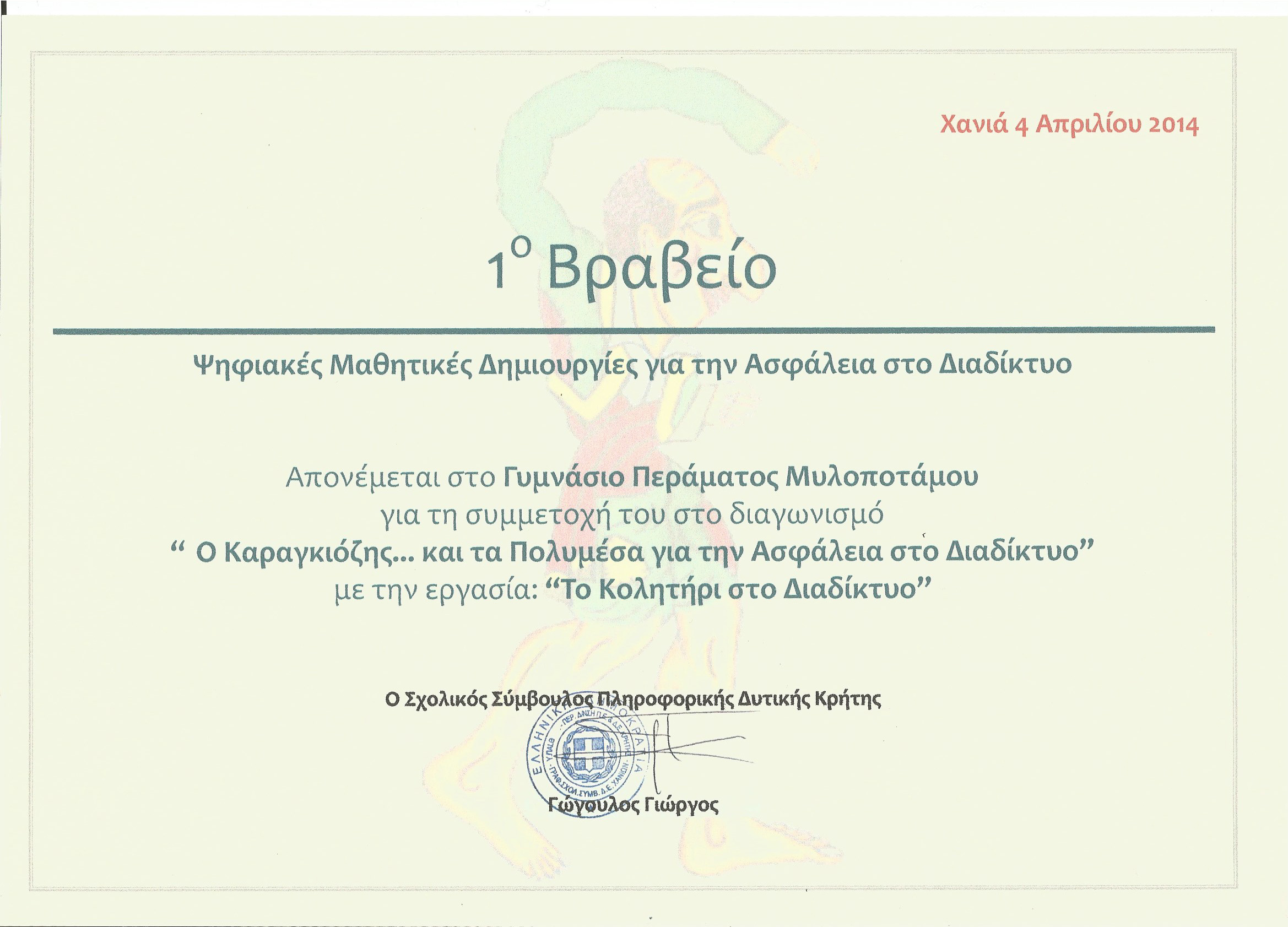 Στα πλαίσια του προγράμματος αυτού οι μαθητές συμμετείχαν στο διαγωνισμό "Ο Καραγκιόζης και τα Πολυμέσα" με δύο σενάρια και ένα βίντεο. Το σενάριο και το βίντεο με τίτλο "Το κολλητήρι στο Διαδίκτυο" απέσπασε το πρώτο βραβείο στο διαγωνισμό. Μπορείτε να δείτε τις εργασίες αυτές κάνοντας κλικ στους παρακάτω συνδέσμους: