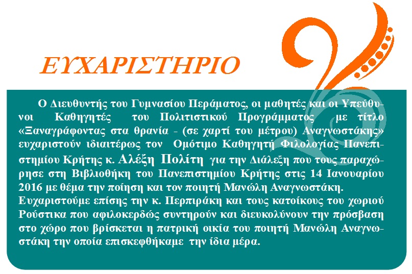 Συνεργάτες: Κατσούλα Αφροδίτη (ΠΕ02), Λαγουδάκη Μαρία (ΠΕ19).