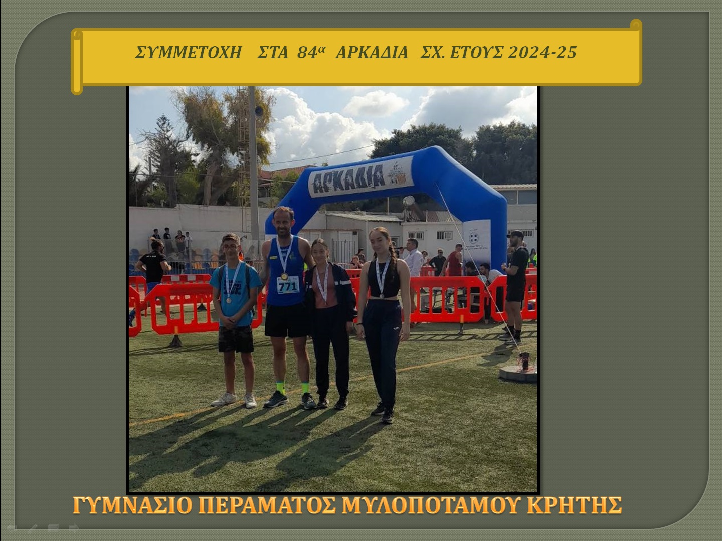 Την Κυριακή 3/11 στο Ρέθυμνο πραγματοποιήθηκαν τα 84α Αρκάδια τα οποία διοργανώνονται κάθε χρόνο από την Περιφερειακή Ενότητα Ρεθύμνης, στη μνήμη του ολοκαυτώματος της Ιεράς Μονής Αρκαδίου. Είναι μια εκδήλωση αθλητικού και πολιτιστικού χαρακτήρα και αποτελούν την αρχαιότερη διοργάνωση στην Ελλάδα. Η εκδήλωση είχε επίκεντρο το Δημοτικό Στάδιο Σοχώρας όπου ήταν το σημείο πραγματοποίησης των πολιτιστικών εκδηλώσεων και τερματισμών όλων των αθλητικών αγωνισμάτων. Στην αθλητική διοργάνωση συμμετείχαν μαθήτριες/ές του Γυμνασίου Περάματος Μυλοποτάμου μαζί με τον γυμναστή τους, με στόχο την ενίσχυση της φυσικής δραστηριότητας και την προώθηση του αθλητικού πνεύματος. Οι μαθήτριες/ές έλαβαν μέρος στον αγώνα δρόμου 2.000 μέτρων, δοκιμάζοντας τις αντοχές και τις ικανότητές τους, ενώ ο γυμναστής στην απόσταση των 6.000 μέτρων και ήταν εκεί για να τους καθοδηγήσει και να τους ενθαρρύνει. Η συμμετοχή στη διοργάνωση αποτέλεσε μια ευκαιρία για τις/ους μαθήτριες/ές να συνεργαστούν, να αναπτύξουν δεξιότητες, και να βιώσουν τη χαρά της συμμετοχής και του υγιούς ανταγωνισμού.