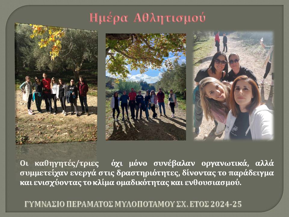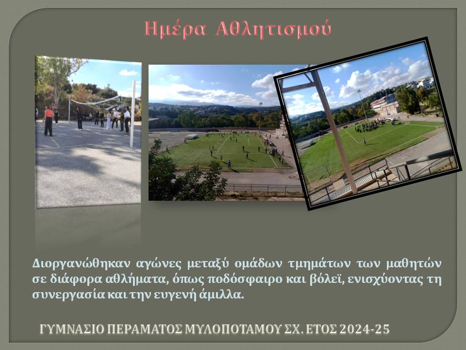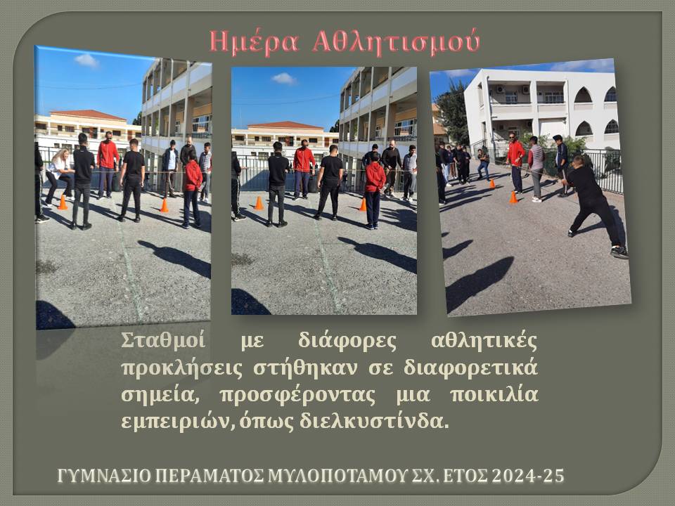 Η Ημέρα Αθλητισμού ήταν μια μοναδική ευκαιρία για όλους τους μαθητές και τους καθηγητές του σχολείου μας να συμμετάσχουν σε αθλητικές δραστηριότητες, να συνεργαστούν και να διασκεδάσουν μέσα από την κίνηση και το παιχνίδι.