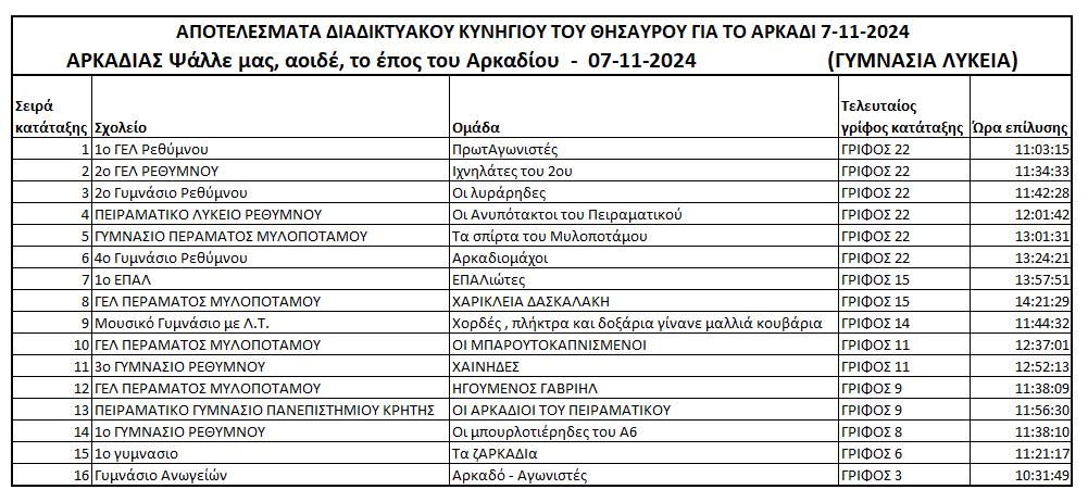 Άλλο ένα διαδικτυακό κυνήγι θησαυρού, για τη θυσία των αγωνιστών του Αρκαδίου το 1866, ολοκληρώθηκε σήμερα Πέμπτη 7/11/2024, για τους/τις μαθητές/τριες των Δημοτικών και των Γυμνασίων - Λυκείων.