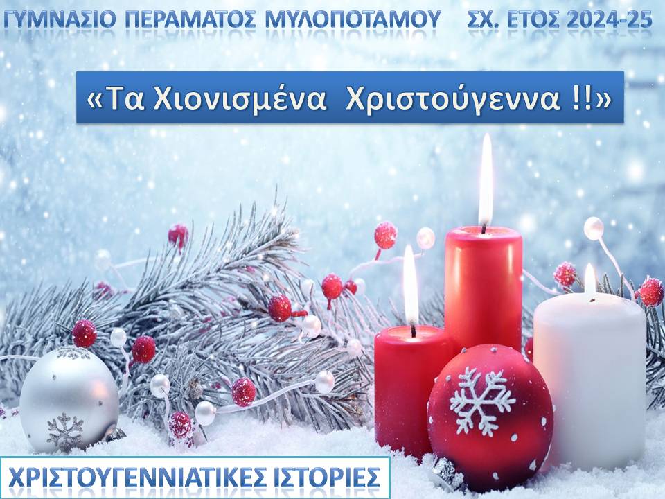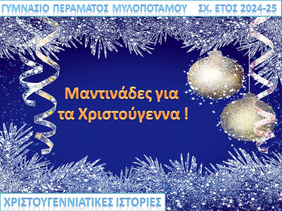 Κάντε κλικ στις παρακάτω εικόνες για να διαβάσετε Χριστουγεννιάτικες Ιστορίες, Μαντινάδες και Παραμύθια του τόπου μας από τους μαθητές και τις μαθήτριες του Γυμνασίου Περάματος.