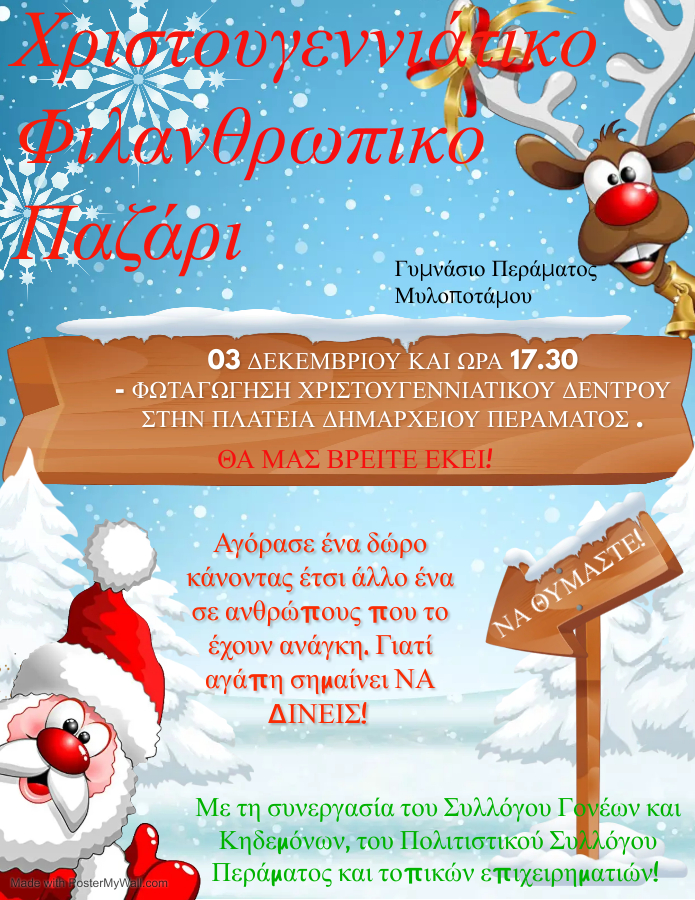 Με επιτυχία διοργανώθηκε και φέτος το Χριστουγεννιάτικο Παζάρι του σχολείου μας σε συνεργασία με το Σύλλογο Γονέων και Κηδεμόνων και τον Πολιτιστικό Σύλλογο Περάματος. Τα έσοδα θα δοθούν σε οικογένειες του Δήμου που τα έχουν ανάγκη.