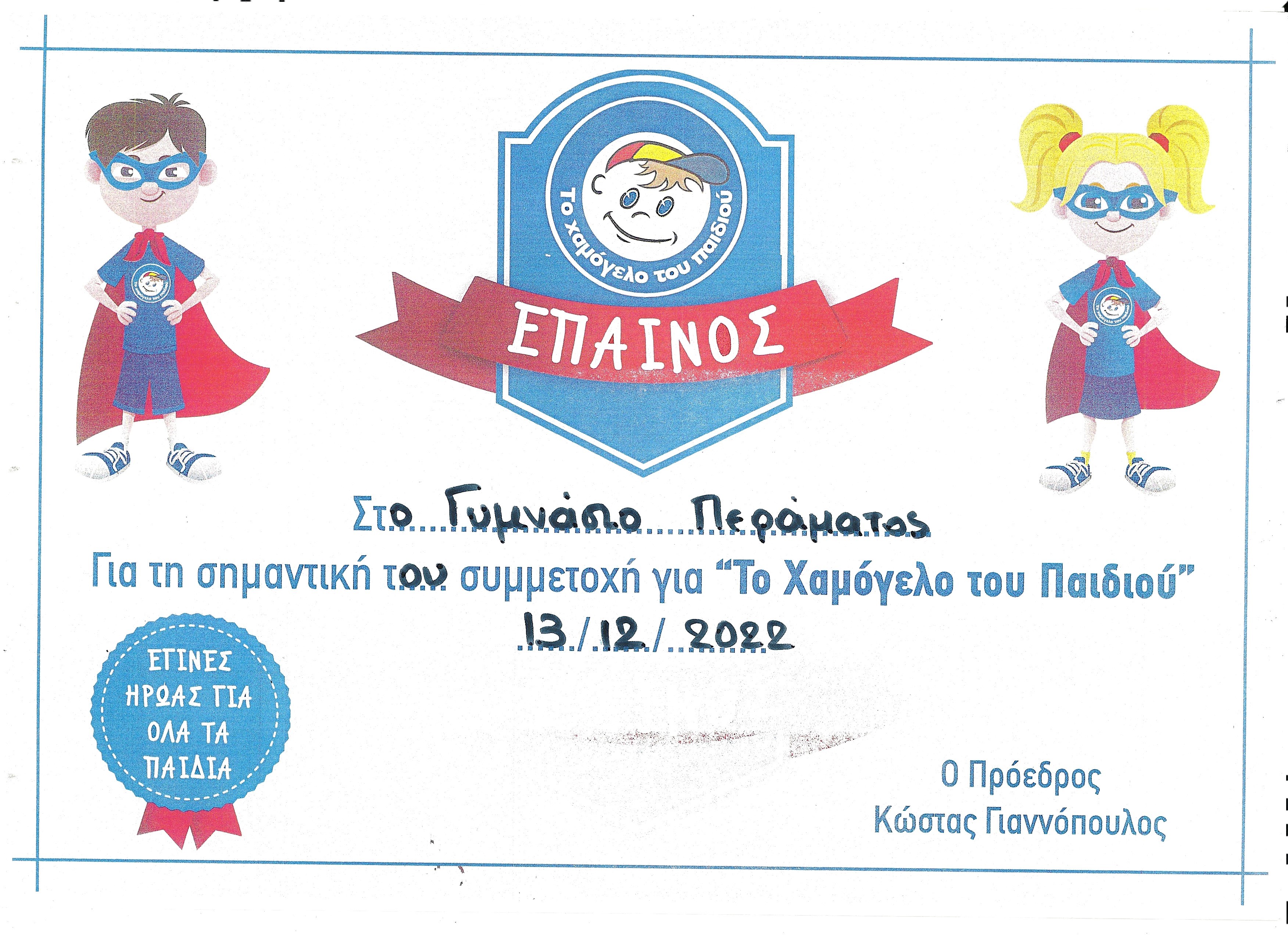 Πριν κλείσουμε τη συνοπτική αυτή παρουσίαση των δράσεων του σχολικού έτους 2023-24 στο Γυμνάσιο Περάματος Μυλοποτάμου Κρήτης θα θέλαμε να ευχαριστήσουμε για ακόμα μια φορά αυτούς που μας βοήθησαν με τις δωρεές τους.