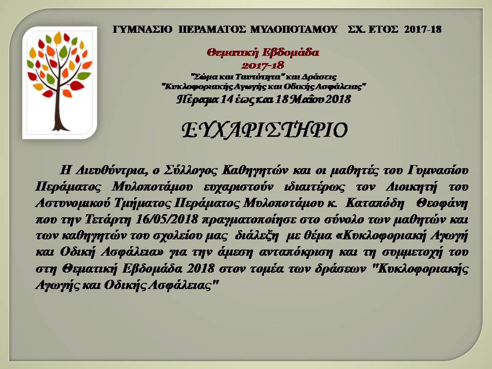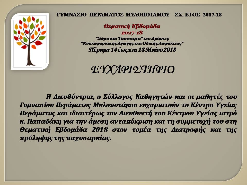 Ο Σύλλογος Καθηγητών/τριών, η Υποδιευθύντρια και η Διευθύντρια του Γυμνασίου Περάματος ευχαριστούν θερμά για τη συμβολή τους στο εγχείρημα του Γυμνασίου Περάματος και την εθελοντική τους προσφορά: