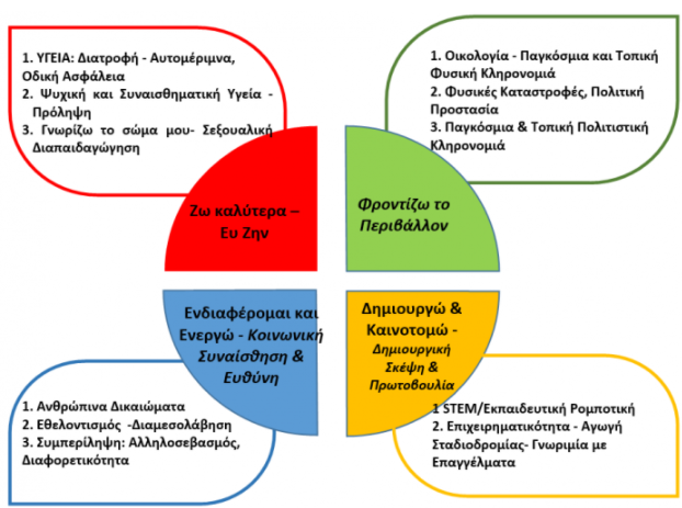 Το πρόγραμμα και το εκπαιδευτικό υλικό των «Εργαστηρίων Δεξιοτήτων» ομαδοποιείται σε τέσσερις (4) Θεματικές Ενότητες:
